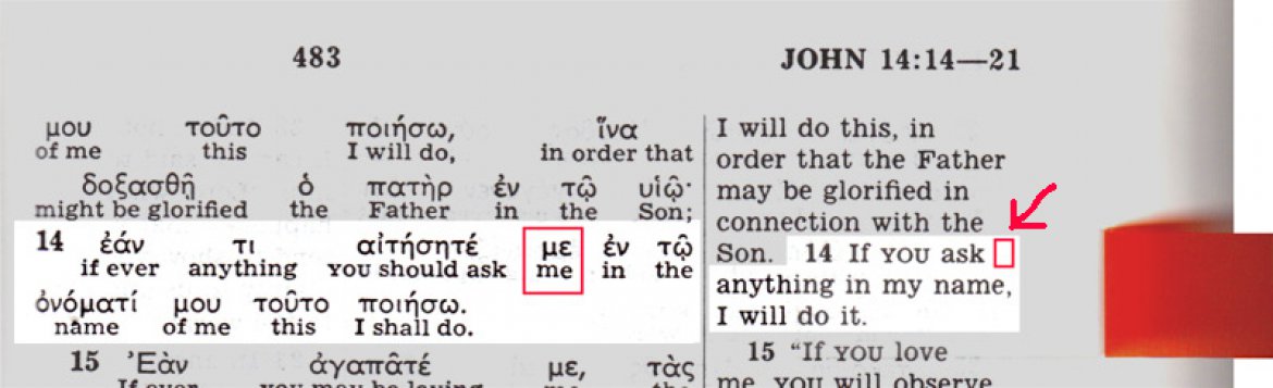 Und dann lies bitte denselben Vers Johannes 14:14 in der Griechischen Interlinear-Übersetzung der Wachtturm-Gesellschaft (siehe Abbildung unten).