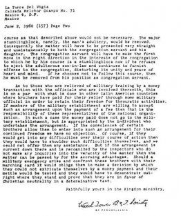 "Wir stehen beide vor dem Abschluss unseres Lebens. Mir steht ganz klar vor Augen, dass wir alle mit Sicherheit vor dem Richterstuhl Gottes stehen werden, wie Paulus sagte, und dass jeder vor Gott wird Rechenschaft ablegen müssen. Sein Sohn wird dann als Richter "auch das im Dunkeln Verborgene ans Licht bringen und die Absichten der Herzen offenkundig machen, und dann wird jedem sein Lob von Gott zuteil werden" (Römer 14:10-12; 1. Korinther 4:5). Da ich genau weiß, wie gut Du die Bibel kennst, kann ich unmöglich glauben, dass Du meinst, irgendwelche Organisationszugehörigkeit oder die Loyalität gegenüber den Interessen einer Organisation würden bei diesem Gericht über unsere Person einen entscheidenden Einfluss haben, oder dass sie überhaupt je eine Bedeutung hätten.