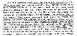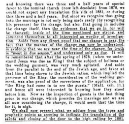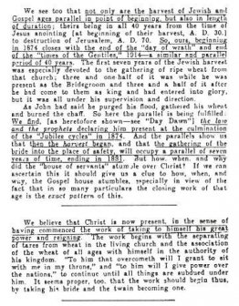 Abzuwarten bleibt, ob diese neue Deutung nur den Boden vorbereitet für eine grundlegende Wende in der Auslegung des Begriffs "diese Generation", Am besten wäre natürlich eine Deutung, bei der man das Jahr 1914 einerseits als "den Beginn der letzten Tage" beibehalten und andererseits zugleich den Begriff "diese Generation" von dem Jahr 1914 erfolgreich abtrennen könnte.