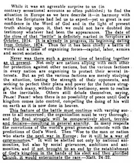 "Dies bedeutet daher, dass von 1914 an die betreffende Generation nicht vergeht, bis dies erfüllt ist, und dies inmitten einer großen Zeit der Drangsal."