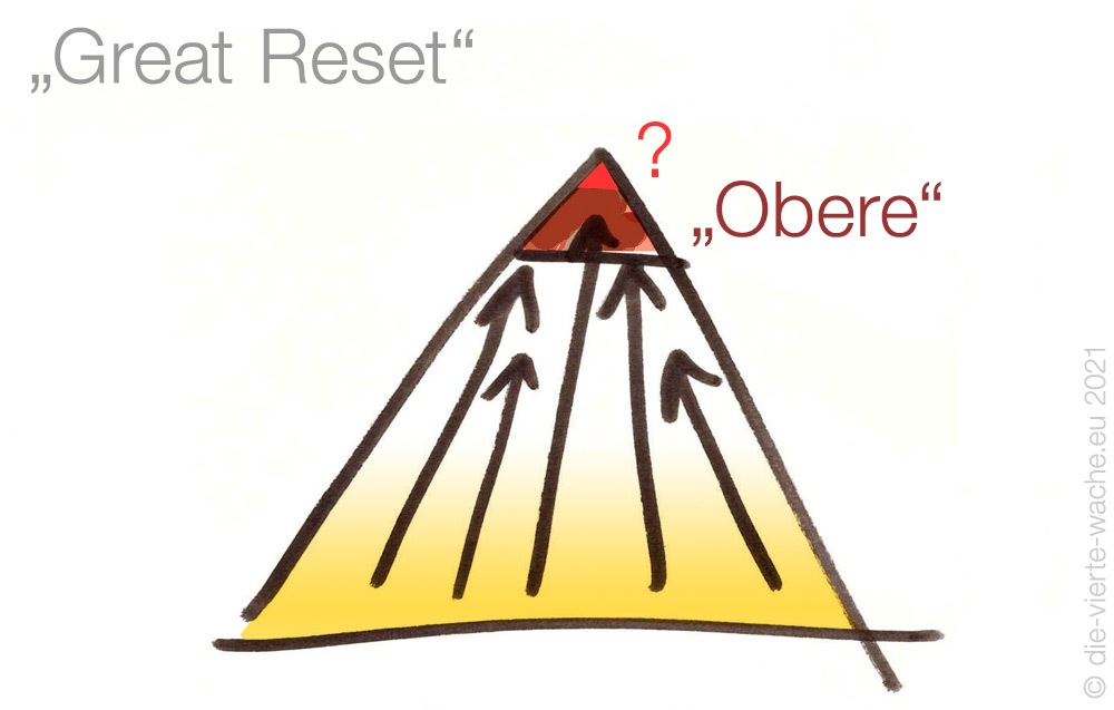Wer oder was ist „oben“? Fast alle Staaten sind hoch verschuldet bei Privatbankiers (die amerikanische Federal Reserve Bank z. B. ist eine Privatbank). Diese relativ kleine Menschengruppe von Privatbankiers erhält durch die Maßnahmen des „Great Reset“ absolute Kontrolle, während die Bevölkerung und jeder Einzelne sich in absolute Abhängigkeit vom System begibt, an das er angeschlossen ist. Den Platz „an der Brust des Systems“ würde man mit dem Verlust von Autonomie, Entscheidungsfreiheit und Menschenwürde bezahlen.
